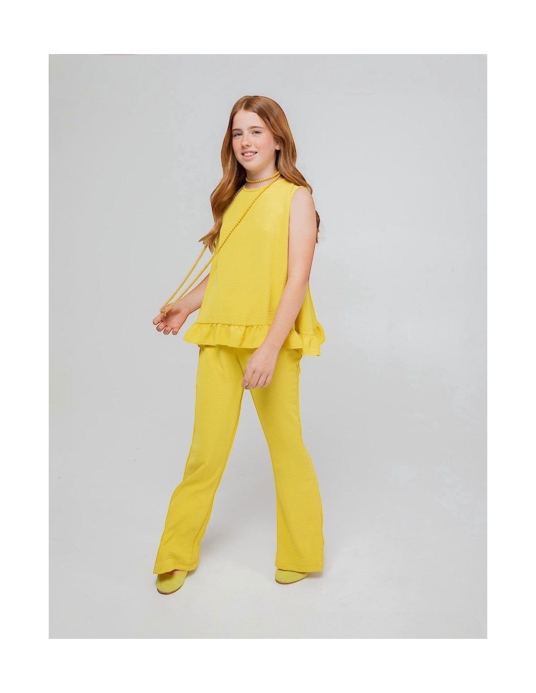 Eve childrenConjunto para teens amarillo lima de tejido fluido con blusa de volantes y pantalón campana. Cómodo, ligero y perfecto para primavera-verano o eventes especiales.