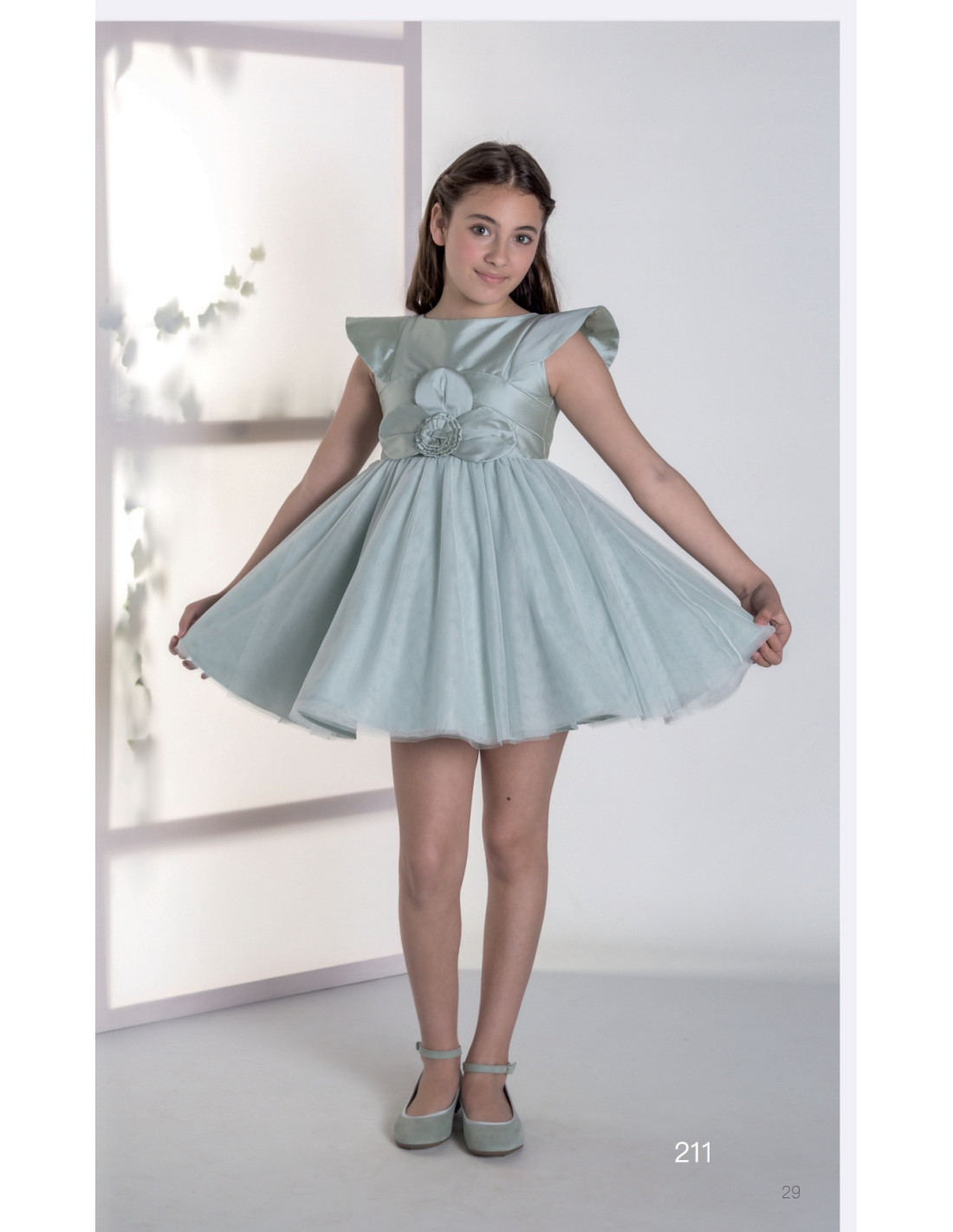 Vestido para ocasiones especiales confeccionado con un delicado cuerpo satinado y falda amplia de tul que aporta volumen y movimiento. Su diseño destaca por un detalle floral central en relieve y los hombros con unas pequeñas mangas estructuradas , que añaden un toque sofisticado y romántico. Perfecto para ceremonias, comuniones, bodas , fiestas y ocasiones especiales, este vestido combina elegancia y dulzura con un toque atemporal. Es una prenda que exlusiva de mucho gusto.